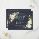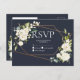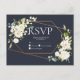 Moderno y de moda, esta invitación nupcial de diseño RSVP presenta un falso cobre geométrico adornado con acuarelas florales blancas y eucaliptos de vegetación floral, sobre una moderna textura azul marino. Esta es la opción de no comer. Parte de un conjunto de bodas coincidentes. Copyright Elegant Invita. Todos Los Derechos Reservados.