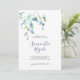 Esta invitación a una ducha con flores de color azul muestra el nombre de la novia to be en una elegante tipografía escrita a mano con detalles del evento en un clásico tipo de letra serif de carbón gris sobre un fondo blanco fresco con un borde superior de mis flores de color de agua originales en tonos azules, verdes y amarillos. La tarjeta de invitación se revierte a un color azul marino de cortesía. Una elección botánica pero elegante para una playa informal y duchas de novias costeras con un tema tropical hawaiano. Para ver toda mi suite de artículos de papelería para bodas, visita DoTellABelle en Zazzle.
