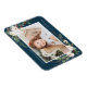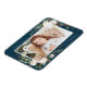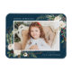 Elegante imán fotográfico de vacaciones con tu foto favorita enmarcada por ramos de flores de marfil acuarela, frondosos follajes verdes, pinos y bayas con fondo marino. Personalice los imanes de vacaciones añadiendo su nombre y un saludo personalizado.