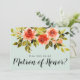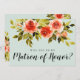 Hermoso diseño de tarjetas Will You Be My Matron Of Honor con rosas de acuarela roja, follaje verde sobre un fondo de menta.