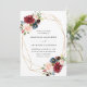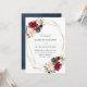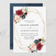 Elegante invitación a una boda floral muestra tus detalles bodas rodeados por un falso marco de Relieve metalizado dorado con ramos de ricas flores de burdeos, rosa rubí, acuarela azul marino y un frondoso follaje verde. El reverso de las invitaciones tiene un fondo de color azul marino opcional.