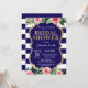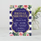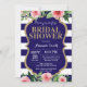 Invitación a la ducha nupcial azul y dorada. Flor acuarela rosa floral.Brillantina dorada. Flor floral rosa. Bandas azul y blanco de la Marina.