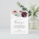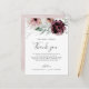 Esta florida tarjeta de recepción de agradecimiento de romance es perfecta para una boda elegante. El moderno diseño rústico de boho cuenta con románticas flores acuáticas en tonos suaves de burdeos, malva, rosa y crema blanca con hojas verdes. Coloque estas tarjetas en la mesa de cada uno de sus invitados en la recepción de su boda. Personaliza la tarjeta con tus nombres y un mensaje especial de agradecimiento.