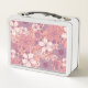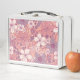 En esta lonchera de mediodía, flores y hojas en tonos pastel de rosa y violeta sobre un fondo rosado.