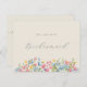 Esta moderna y elegante tarjeta de presentación "Will You Be My Bridesmaid" presenta unas llamativas flores silvestres de acuarela bohemias en tonos vivos y coloridos. Con un diseño botánico y un sencillo guión de caligrafía, ofrece una manera sincera y elegante de pedir a sus amigos más cercanos que se paren a su lado en su gran día. ¡Perfecto para una celebración boda de boho-moda!