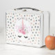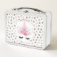 Bonito, unicornio de color pastel con flores, de vuelta a la escuela metalizado caja de almuerzo, con un bonito fondo de punto de polka. Añade tu nombre para un tema mágico de unicornio para chicas.