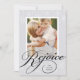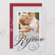 Elegante tarjeta fotográfica navideña presenta un fondo gris pálido salpicado con festivos copos de nieve blancos, con tu foto favorita vertical o orientada a retratos enmarcada por un borde blanco. "Regocijo" aparece en la parte inferior en la escritura tradicional de caligrafía negra, con el nombre de tu familia oculto en el diseño. Personalice la festividad roja de vuelta con tres fotos adicionales y un saludo de Navidades personalizados.