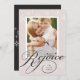 Elegante tarjeta fotográfica navideña presenta un suave fondo de color azul cameo salpicado de festivos copos de nieve blancos, con tu foto favorita vertical o orientada a retratos enmarcada por un borde blanco. "Regocijo" aparece en la parte inferior de la escritura caligráfica tradicional, con el nombre de tu familia escondido en el diseño, en gris carbón rico. Personalice el fondo gris oscuro con tres fotos adicionales y un saludo de Navidades personalizados.