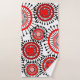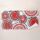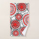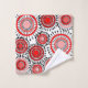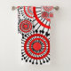 Este juego de toallas tiene un diseño de anillos y círculos en tonos rojos con líneas negras cruzando detrás de ellos formando flores en un campo blanco.