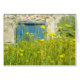 Flores de acuarela amarillas en flor con puerta de madera azul y pared de piedra