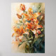 Esta exquisita pieza captura la belleza efímera de las lirios tigres en plena floración. El artista emplea con maestría un delicado equilibrio de acuarelas, haciendo que las flores tengan una calidad etérea. Cada pétalo, pintado con meticulosa atención a los detalles, parece bailar en un ballet armonioso de colores —tonos naranjas besados por el sol, adornados con moquetas que cuentan historias de la artesanía de la naturaleza. Esta obra de arte se exhibe idealmente en espacios que abarcan luz natural y elementos. Considere colocarlo en una sala de estar adornada con muebles minimalistas, en la que sus colores vivos pueden resaltar la vida y el calor. La pintura se complementa con acentos de madera y plantas verdes en el interior, creando un entorno donde el arte y la naturaleza se funden en un santuario sereno.