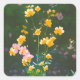 Una escena serena y soleada de flores silvestres brillantes amarillas y rosas en un frasco de vidrio, colocado en un exuberante y verde prado. El fondo está ligeramente difuminado, con una luz suave y nublada que se filtra a través de los árboles, creando un ambiente tranquilo y romántico.