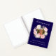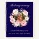 Un libro de invitados para un funeral o funeral. Un fondo azul oscuro clásico, decorado con una corona floral rosa y blanca. Personalice y agregue una foto, nombre y fechas.