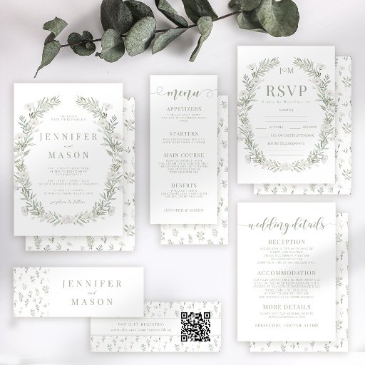 Flores blancas verde rústico Invitación a la boda