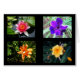 Una colección de cuatro flores bonitas, con un fondo negro y la tarjeta en espacio en blanco en el interior.