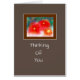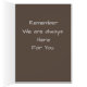 Una brillante pintura artística de flores en una tarjeta de condolencias. El texto dice "Pensando en ti". El texto interior dice "En momentos como este, recuerda que siempre estaremos aquí para ti". Esta tarjeta también sería adecuada para desear una pronta recuperación.