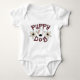 Si amas a los perros te encantará este lindo diseño de perro con un perro blanco con manchas marrones, dos flores y un texto rojo que dice "Perro Cachorro Cachorro" en camisetas para perros, cadenas de llaves, bolsas de tote, muelles, y más.