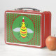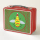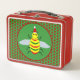 Esta impresionante Lunch Box presenta una linda abeja amarilla con ojos negros brillantes y piernas negras. Las antenas son verdes y las rayas de la abeja alternan entre verde y amarillo. La abeja está usando un gorra rojo y blanco y parece estar lista para celebrar a los Navidades. El fondo está formado por flores de la posina roja bonito, cada una con un centro amarillo chillón.