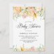 Flores y Oro de Peach deja la invitación de Baby Shower. Celebra que la madre esté con esta elegante invitación a la ducha de bebé. Esta invitación floral a la ducha de bebé incluye flores de melocotón acuarelas con acentos falsos de hojas de Relieve metalizado dorado y un guión elegante de caligrafía. Perfecto para las duchas de primavera.