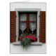 Marco de ventana y persianas con flores rojas en Vaduz, Liechtenstein.