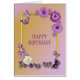 Una preciosa tarjeta de cumpleaños floral. Flores y mariposas en un marco dorado.Un tema lila le da un ambiente relajado y lujoso. Una tarjeta maravillosa para darle a alguien que usted cuida en su cumpleaños.