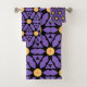 Patrón decorativo, hexágonos en amarillo, negro y morado. Un pequeño punto rosado en medio del amarillo.
