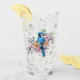 Un pájaro marino azul rodeado de flores primaverales rosas, violetas y color melocotón pastel colocadas sobre un fondo azul claro.