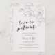 Tarjeta de anuncio de postergación de boda elegante y moderna que presenta una ilustración dibujada a mano de flores de magnolia en colores marfil y gris con un texto en letra script debajo que dice "el amor es paciente."