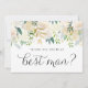 ¿Serás mi mejor hombre? Esta floral tarjeta de presentación Best Man presenta flores acuáticas en tonos neutros con vegetación y sutiles acentos de Relieve metalizado de oro. Es perfecto para bodas con un tema clásico o neutro. Una buena manera de pedirle a su amigo más cercano que sea parte de su día especial. Personalízalo con tu propio mensaje para convertirlo en algo único. Esta mejor tarjeta de hombre es parte de una completa colección de papel de boda, que ofrece diseños coordinados para todo su boda.