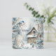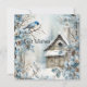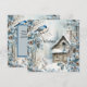 Un delicado azul pastel domina las flores, el pájaro y la antigua casa en esta tarjeta de Navidad que desea "Felices Fiestas".