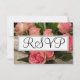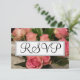 RSVP de boda escrito en elegante letra negra dentro de un marco geométrico de color blanco y plata contra flores de rosa rosa. Fondo suave rosa pastel. Encantador para una boda de primavera o verano. Personalice la parte posterior en color dorado y texto negro contra fondo blanco crujiente. Fotografía y diseño original de TamiraZDesigns.