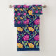 Elegante Patrón Floral Flores Pink Yellow Buds Greeneration - Un bonito diseño floral con flores nítidas rosas y amarillas con vegetación en el fondo azul y bordes azules a juego.