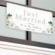 Celebra el alegre viaje del matrimonio con nuestro elegante diseño "Just Married", decorado con delicadas flores blancas. Perfecto para añadir un toque de brillo y encanto al coche de escapada de la pareja, es una forma encantadora de anunciar su condición recién casada con estilo.
