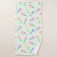 Este juego de toallas incluye una toalla de mano de color azul claro, una toalla de mano de color azul más oscuro y una toalla de baño con un diseño de círculos y partes de círculos de estilo moderno de mediados de siglo, hechos para parecer flores con tallos creados por líneas continuas que se repiten en el diseño.