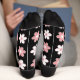 Flores modernas, rosas y blancas, en los calcetines negros.