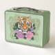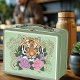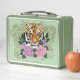 Retrato de tigre con flores rosadas y moradas claras. Henna alrededor del tigre en un fondo de verde.