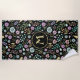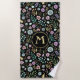 Espectáculo floral de boho, colores llamativos, diseño floral de moda. Flores, hojas, brotes y bayas. Rosa, azul, verde, dorado (color, no oro real), violeta y naranja. El fondo negro hace que los colores aparezcan. Monograma negro + oro (el oro no es oro real sino color). ¡Fácil de ver en una playa concurrida!