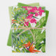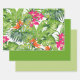 Juego de papel de envoltura de tres hojas. La hoja 1 es un diseño de hojas verdes tropicales con flores rosadas y naranjas brillantes. Las hojas 2 y 3 coordinan las hojas verdes sólidas. Póngase en contacto con nosotros para obtener ayuda sobre la personalización o para solicitar productos de correspondencia o coordinación.