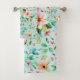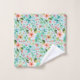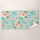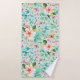 Hermosa toalla de baño rosa con motivos florales colocada sobre un fondo azul.