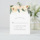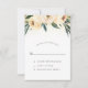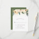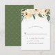 Un hermoso diseño de RSVP con tipografía elegante y un borde de flores de acuarela rosadas. Detrás de las flores hay una imagen de confeti dorado. Estas tarjetas tienen un reverso con un patrón blanco simple sobre un fondo verde.