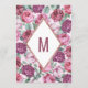 Elegantes, chic y flores campestres en rosa y púrpura con tipografía de secuencias de brillo de rosa dorada impresa falsa en un fondo de rosa suave claro, tarjetas de menú de recepción de boda. Este diseño clásico y sofisticado es perfecto para la recepción de boda elegante, con estilo y tendencia. Personalice con su propio menú en la parte frontal, junto con sus nombres y fechas. Luego personalice la parte trasera con la inicial de su monograma. Todo el diseño de impresión de foto.