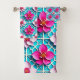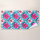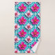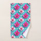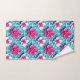 Patrón floral vibrante y repetitivo con flores rosadas sobre un fondo azul geométrico intrincado. Una mezcla dinámica de belleza y simetría perfecta para diseños, textiles y proyectos creativos.