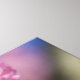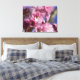 Dibujo de pintura mural de tela con una foto macro de un árbol japonés de flores de cerezo rosado. Ramas cubiertas de brotes exuberantes y flores en tonos rosas suaves con un cielo azul brillante que asoma por la pared.