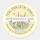 Abeja de miel con flores silvestres locales —como la camomila, la lavanda, la margarita, el flor de maíz, el encaje de la reina Ana— encerrada en un marco circular sobre un fondo rayado amarillo bonito. Nombre de la página que se muestra en el centro de la etiqueta en un tipo de letra decorativo.