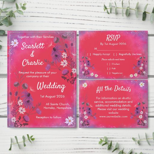 Vibrante diseño rosa frambuesa dibujado a mano con flores silvestres para papel de boda - boda ahorrando tarjeta de fecha