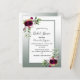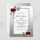 Delante: Gradiente verde sabio con un marco verde sabio y blanco. Decorado con flores, rosas en burdeos con vegetación. Plantillas para los nombres de la novia y detalles del fiesta. El nombre y la ducha de novia están escritos con un guión de estilo con letras a mano, letras de color negro. Fondo: fondo de degradado verde sabio. Sugerencia: Si no desea que se vea como una postal, haga clic en personalizar, vaya a la parte posterior y quite el separador y el sello postal.