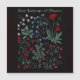 Floriografía: lenguaje amoroso de las flores de la era victoriana en un diseño moderno, con guisantes dulces, margarita, amapola, azul, mistletoe en un fondo negro. Gran estampado de arte de herbario de flores silvestres para un interior bohemio, como regalo para San Valentín, para una habitación de chicas o como regalo boda divertido. En los colores salpica azul rojo blanco rosa y negro, gran diseño botánico de flores silvestres oscuras con mensajes manuscritos en cada flor.
