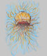 Una medusa llamativa se representa con tendriles coloridos y fluidos. Las intrincadas líneas de blues y naranjas vibrantes dan un sentido de movimiento y gracia. Esta imagen capta la delicada belleza de la vida marina con un toque artístico.