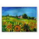 Paisaje toscano, colorido, vibrante, expresiva belleza de la flora italiana de verano y campos en naranja amarillo brillante, verde, marrón, colores azules, hermosas flores, cipreses y olivos, antigua granja rústica bajo el cielo azul. Pintura acrílica sobre lienzo.