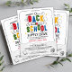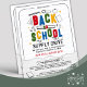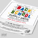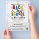 Cuéntenos a todos sobre su campaña Back to School Supply Drive con este volante creativo con tipografía colorida en 3D, "De vuelta a la escuela", fondo de líneas onduladas, papel roto y ilustraciones divertidos de útiles escolares con estrellas amarillas.